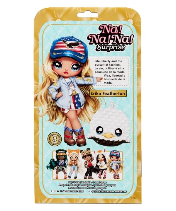 Na! Na! Na! Surprise Erika Feathert je mäkká fashion bábika so štýlovou kabelkou v zvieracom dizajne. Kabelku môžeš použiť ako módny doplnok na batoh alebo tašku a zároveň do nej uložiť svoju bábiku.