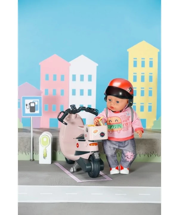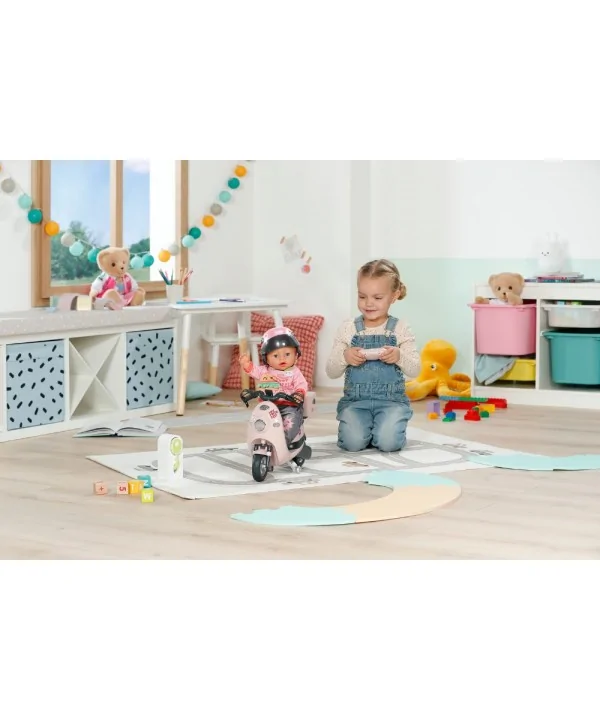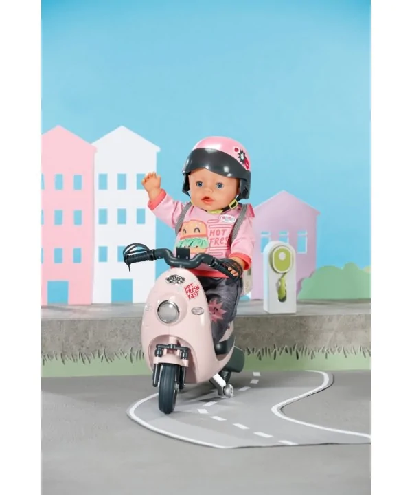 BABY born Elektrický skúter je jazdiaci doplnok so zvukmi pre bábiku 43 cm. Realistická jazda, svetlá a veľa zábavy pre malé cestovateľky!