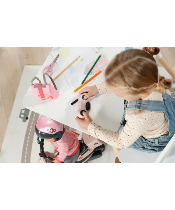 Skúter má krásny farebný dizajn s detskými motívmi, pevnú konštrukciu a široké sedadlo, aby BABY born sedela stabilne a pohodlne. Nechýbajú ani bezpečnostné držadlá, svetlá a ozdobné prvky, ktoré dodávajú skútru štýlový vzhľad. Deti môžu svoju bábiku posádzať, prevážať a vytvárať príbehy, v ktorých spolu jazdia do škôlky, na výlet alebo na nákupy.