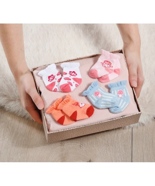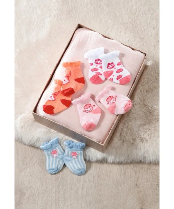Každý pár je zdobený veselými detskými motívmi. Ružové ponožky s bielymi bodkami zdobí obľúbená ovečka Baby Annabell. Na bielych ponožkách lieta motýlik medzi jemnými ružovými obláčikmi. Modro-biele pruhované ponožky dopĺňa rozkošná muchotrávka a z oranžových ponožiek vykúka zvedavá veverička.