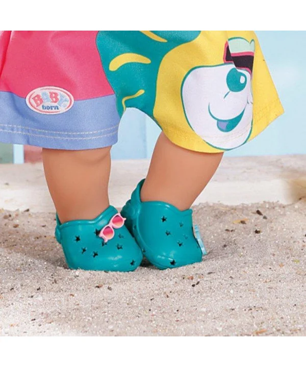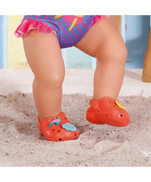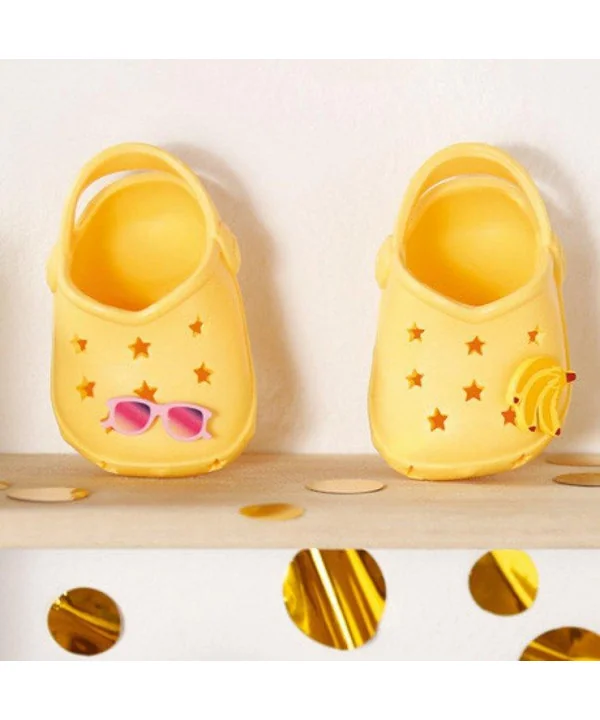 V najnovších ffarebných sandálikoch s roztomilými nacvakávacími ozdobami sa bude BABY born všade pohodlne chodiť. Sú prázdniny! Na dovolenke toho môžeme veľa zažiť a objaviť. K tomu ale potrebujeme topánky, ktoré sú vhodné aj do vody, a ktoré môžeme rýchlo vyzuť, keď chceme ísť na pieskovisko. BABY born Gumové sandáliky sú k dispozícii v štyroch rôznych farbách. Žlté ako slnko, zelené ako tráva, fialové ako orgován a červené ako jahodová zmrzlina. S roztomilými nacvakávacími ozdobami môžete sandáliky ozdobiť každý deň inak.